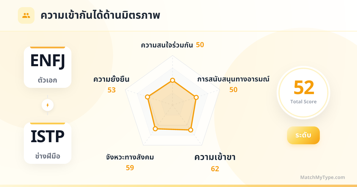 จุดร่วมของคุณอยู่ที่ **Se (การรับรู้ภายนอก)** การไปสัมผัสสิ่งใหม่ๆ และตื่นเต้นด้วยกันคือสายสัมพันธ์ที่ดีที่สุด ENFJ ชอบที่มีคนไปสัมผัสประสบการณ์ด้วยกัน ISTP ชอบศึกษาเทคนิค เช่น ไปโต้คลื่นด้วยกัน ISTP สอนเทคนิคให้ ENFJ ส่วน ENFJ รับหน้าที่ถ่ายรูปและชมว่า ISTP เท่มาก เป็นสถานการณ์ที่ชนะทั้งคู่