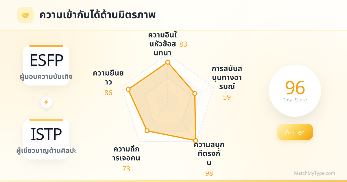 - 3**การตำหนิกันและกัน**: ESFP ด่า ISTP ว่า 'เหมือนหุ่นยนต์' ส่วน ISTP ด่า ESFP ว่า 'สมองไม่สั่งการ'