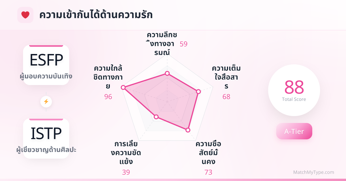 ความสัมพันธ์ระหว่าง ESFP และ ISTP เปรียบเสมือนเหล้าแรงๆ ที่ใส่ผงเป๊าะแป๊ะ ตื่นเต้น ตรงไปตรงมา และชวนให้มึนเมา พวกคุณทั้งคู่ไม่ชอบเล่นเกมหัวใจ แทนที่จะมานั่งคุยเรื่อง 'คำนิยามของความรัก' สู้ซื้อตั๋วเครื่องบินไปโต้คลื่นที่ทะเลเลยยังดีกว่า นี่คือความสัมพันธ์ที่ตั้งอยู่บนพื้นฐานของ 'ประสบการณ์ร่วมกัน' ไม่ใช่ 'การสื่อสารทางจิตวิญญาณ' ซึ่งเต็มไปด้วยกลิ่นอายของโดพามีน
