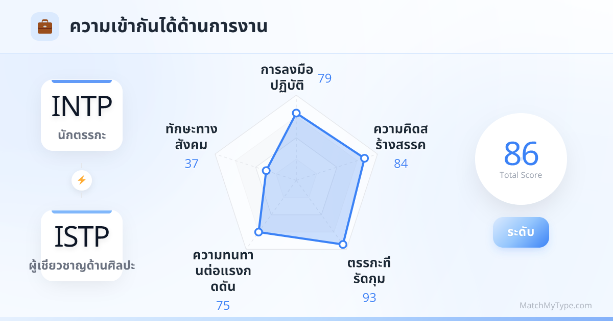 วงจรที่สมบูรณ์แบบของทฤษฎีและปฏิบัติ INTP เก่งในการหาช่องโหว่ทางตรรกะเชิงระบบและเสนอวิธีปรับปรุง ISTP เก่งในการใช้เครื่องมือในมือเพื่อแก้ปัญหาเฉพาะหน้าอย่างรวดเร็ว INTP ชี้ทาง ISTP ถางถนน ในสาขาโปรแกรมมิ่ง วิศวกรรม ศัลยกรรม หรือการสืบสวน ความเข้ากันได้จะสูงมาก