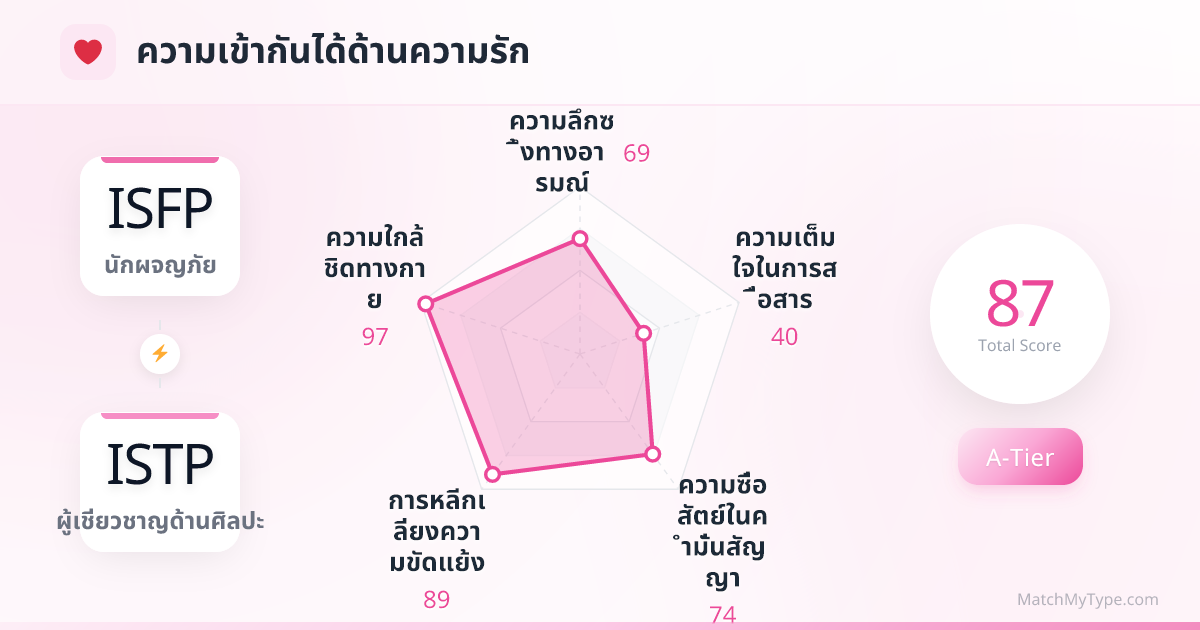 นี่ไม่ใช่แค่การปะทะกันของบุคลิกภาพ แต่เป็นการดวลกันของ **ฟังก์ชันการตัดสินใจ**: **Fi (Introverted Feeling) x Ti (Introverted Thinking)**: นี่คือจุดต่างที่ใหญ่ที่สุดของคุณ ISFP (เน้น Fi) ตัดสินใจจาก “ฉันชอบ” หรือ “มันตรงกับคุณค่าของฉัน” ส่วน ISTP (เน้น Ti) ตัดสินใจจาก “มันสมเหตุสมผล” หรือ “มันมีประสิทธิภาพที่สุด” **การกำทอนของ Se (Extraverted Sensing)**: นี่คือกาวใจของความสัมพันธ์ คุณทั้งคู่อยู่กับปัจจุบัน ชอบอาหารอร่อย การเดินทาง กีฬา และเรื่องเซ็กซ์ Se ทำให้คุณเล่นสนุกด้วยกันได้ แต่เมื่อ ISFP ต้องการพูดคุยเรื่องอารมณ์เชิงลึก (Fi) ISTP มักจะตอบกลับด้วยตรรกะที่เย็นชา (Ti) ทำให้ ISFP รู้สึกว่าอีกฝ่าย “ไร้หัวใจ” และ ISTP รู้สึกว่าอีกฝ่าย “งี่เง่าไม่มีเหตุผล”