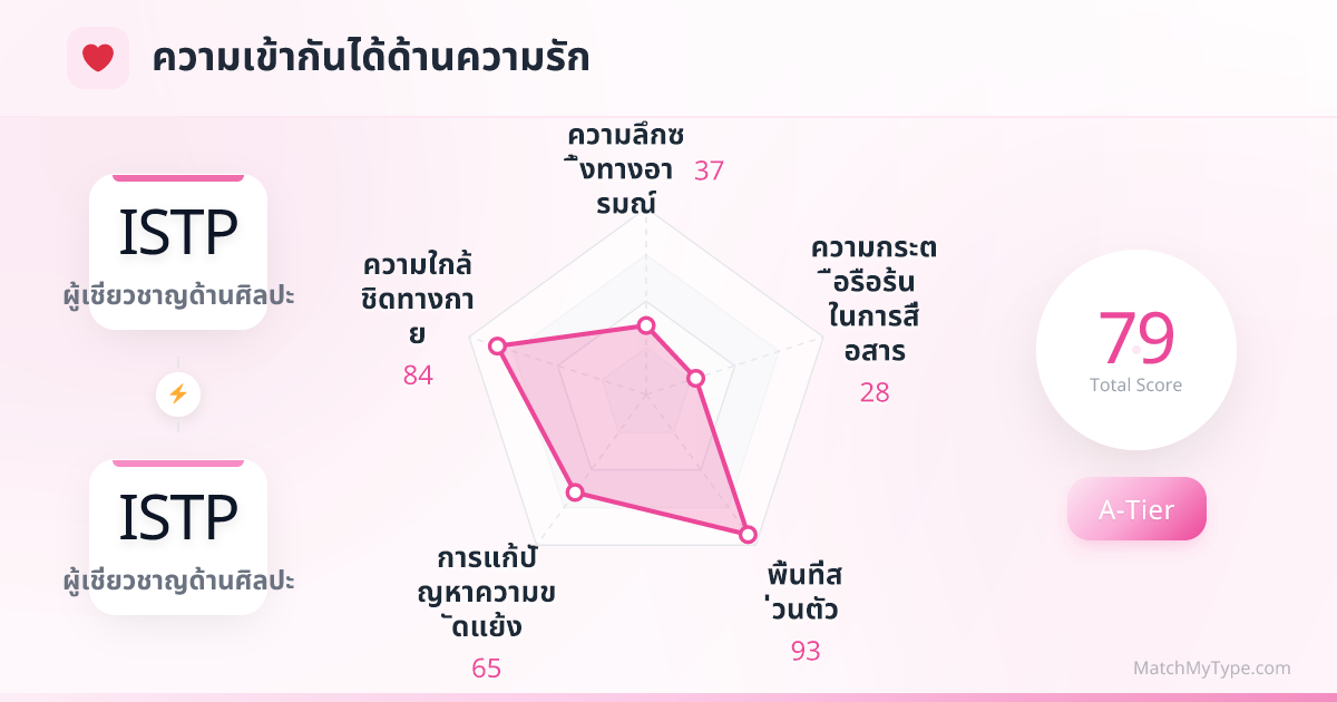 การรวมตัวกันของ ISTP และ ISTP เหมือนกับจิ๊กซอว์สองชิ้นที่ล็อกเข้าด้วยกันได้อย่างสมบูรณ์แบบ ไม่ใช่เพราะรูปร่างที่ส่งเสริมกัน แต่เป็นเพราะเนื้อแท้ที่เหมือนกัน คุณทั้งคู่ไม่ชอบดราม่าทางอารมณ์ และเกลียดการถูกควบคุม ความสัมพันธ์นี้มักจะเริ่มต้นจากการ 'เล่นด้วยกันได้' และจบลงที่ 'ความเคยชิน' โดยตัดขั้นตอนการวิเคราะห์ความรู้สึกที่ยืดยาวออกไป