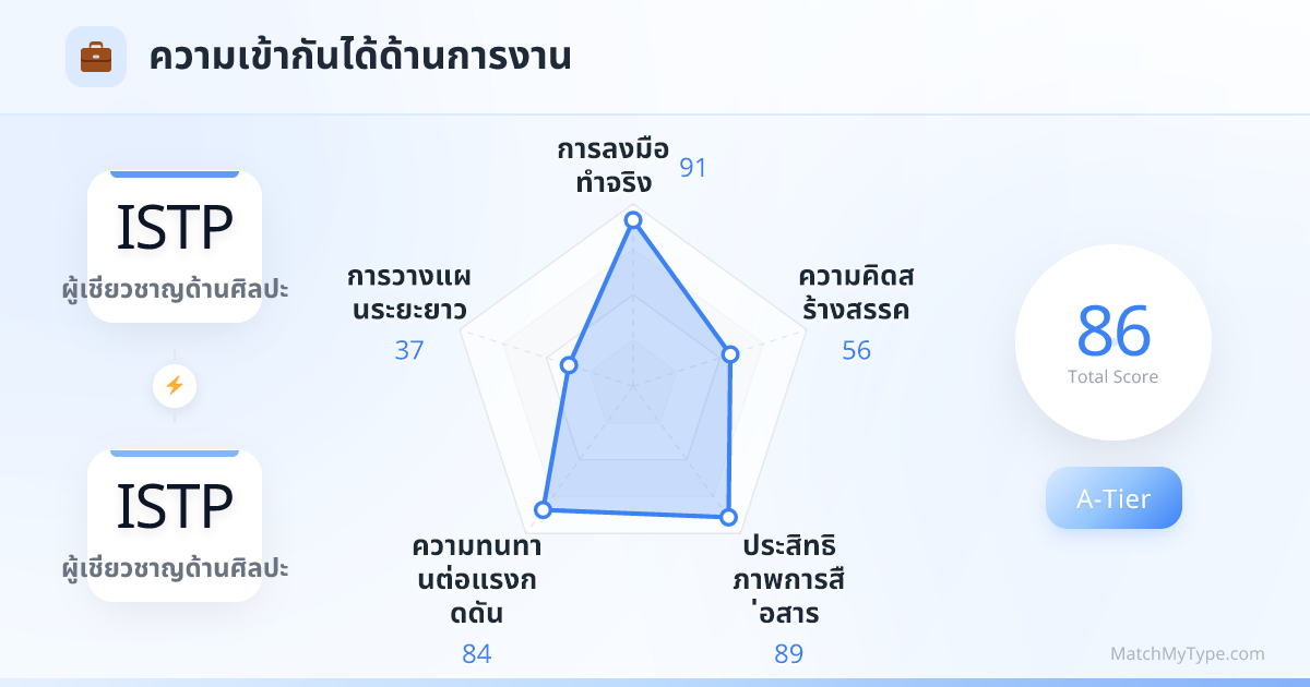 ความสามารถในการปฏิบัติการทางยุทธวิธีขั้นสุดยอด คุณไม่จำเป็นต้องประชุมเพื่อคุยว่า 'จะทำอย่างไร' แค่มองตากันเพื่อยืนยัน แล้วแยกย้ายกันไปทำ ในสาขาวิศวกรรม การผ่าตัด การกู้ภัยฉุกเฉิน หรืองาน IT ที่ต้องการสมาธิสูงและทักษะการลงมือทำ คุณคือคู่หูที่มีประสิทธิภาพสูงสุด คุณสามารถทนต่อสภาพแวดล้อมที่วุ่นวายและจัดระเบียบตรรกะจากมันได้