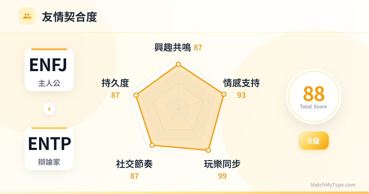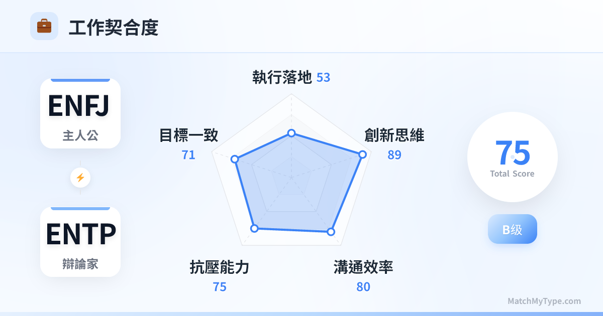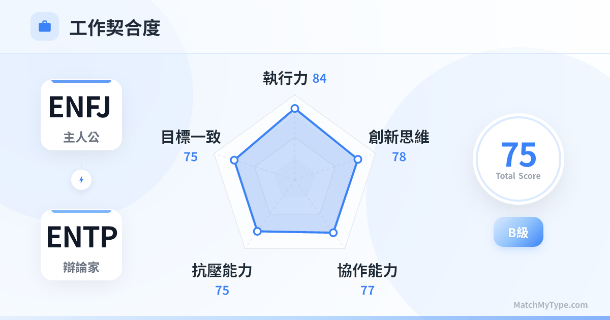 腦力激盪的最佳拍檔。在會議室裡,你們是雙人相聲演員,能把氣氛炒得火熱。但在分工上,請務必明確:ENTP 搞技術/創意攻堅,ENFJ 搞人際/流程協調。千萬別讓 ENTP 去做客戶關懷,也別讓 ENFJ 去做純邏輯糾錯。