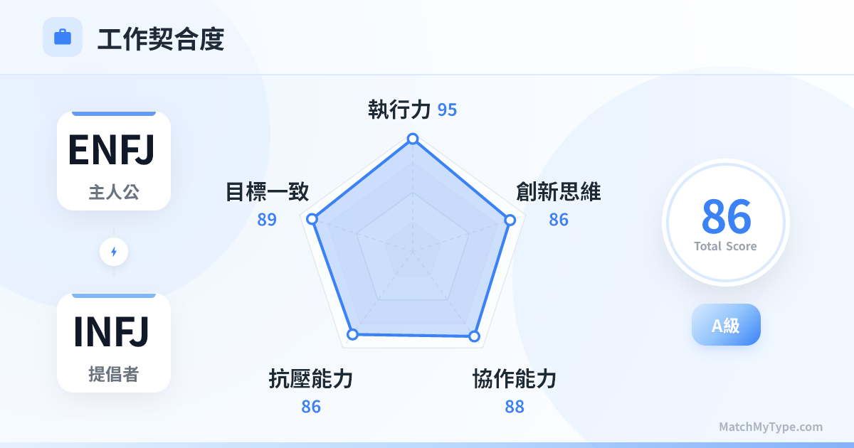 激勵型領導。ENFJ 老闆非常欣賞 INFJ 的深度和忠誠,會給 INFJ 很大的空間去思考。但 ENFJ 有時會過度頻繁地拉 INFJ 開會「腦力激盪」,這會打斷 INFJ 的心流。建議 ENFJ 減少形式主義的會議,允許 INFJ 書面彙報。