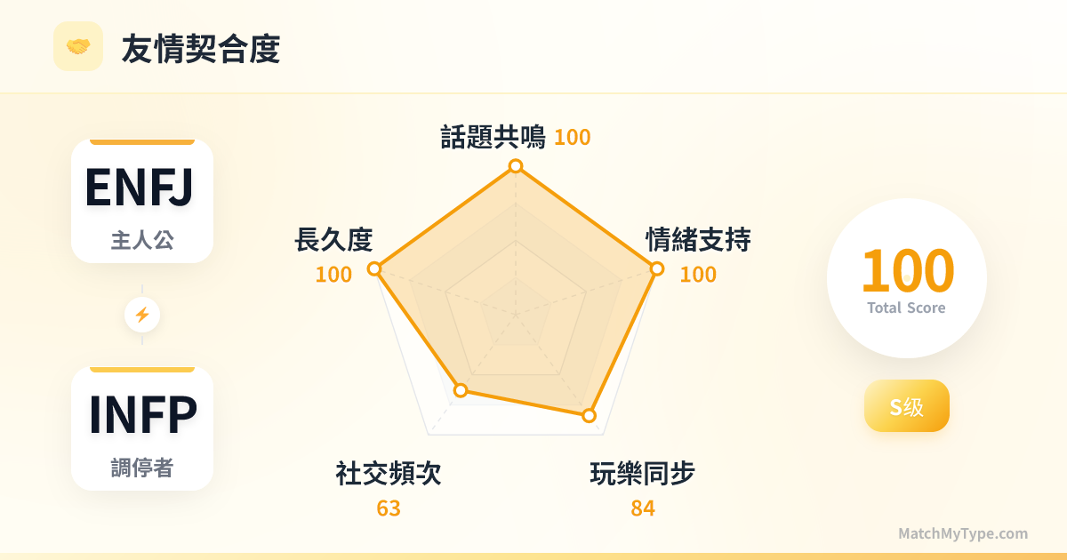 你們是那種可以半年不聯繫,一見面就聊通宵的知己。ENFJ 負責把 INFP 拉出家門看世界,INFP 負責讓 ENFJ 停下來看內心。在浮躁的世界裡,你們是彼此的精神避難所。