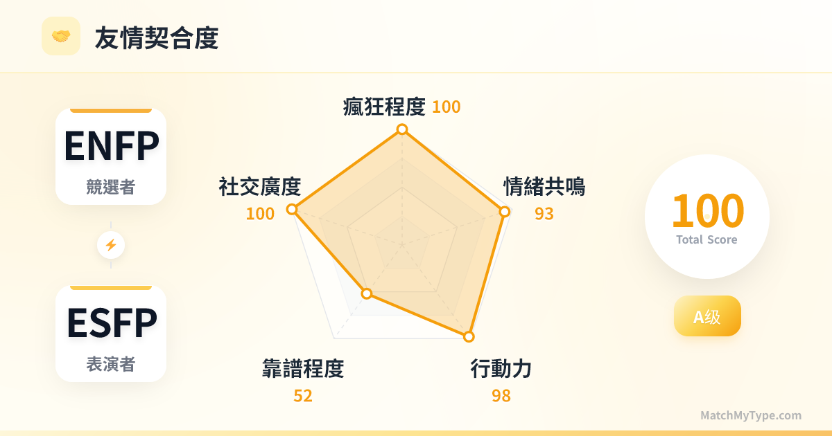 這是 MBTI 宇宙中最好玩的一對朋友。你們在一起就是「快樂」的代名詞,是那個在聚會上笑得最大聲、在 KTV 裡搶麥克風的組合。