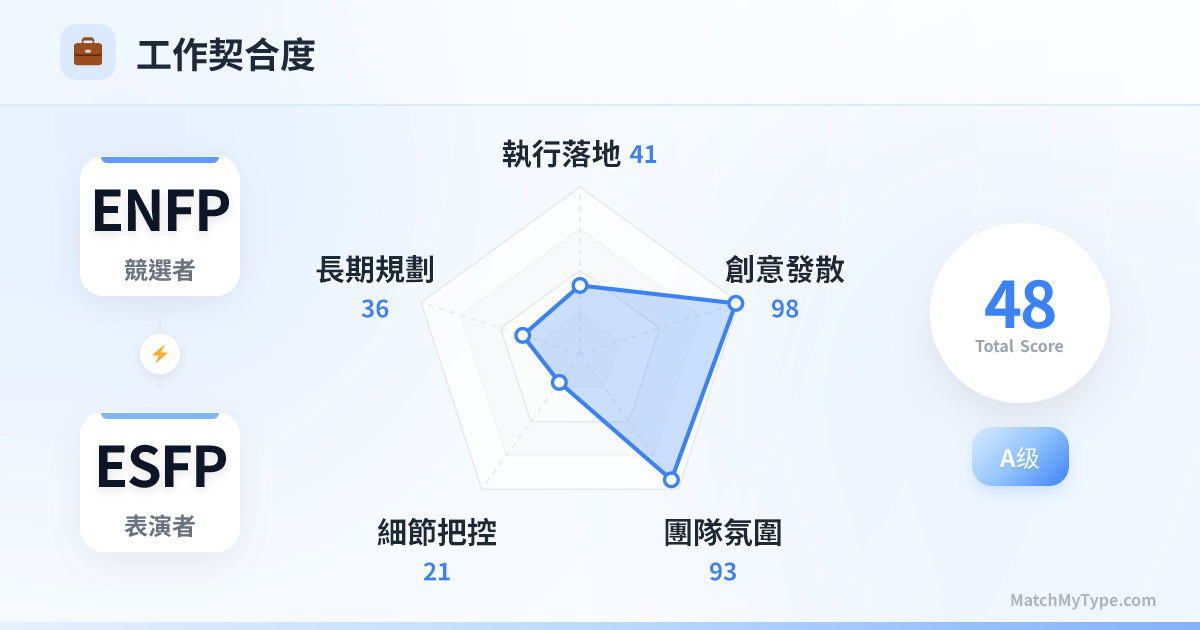 氣氛組天花板。在需要破冰、搞活氣氛、腦力激盪、銷售簡報或公關活動的場合,這對組合無敵。ENFP 負責描繪宏大的願景(畫大餅),ESFP 負責用極具感染力的表現力將願景呈現出來(賣大餅)。你們能瞬間點燃客戶或團隊的熱情。