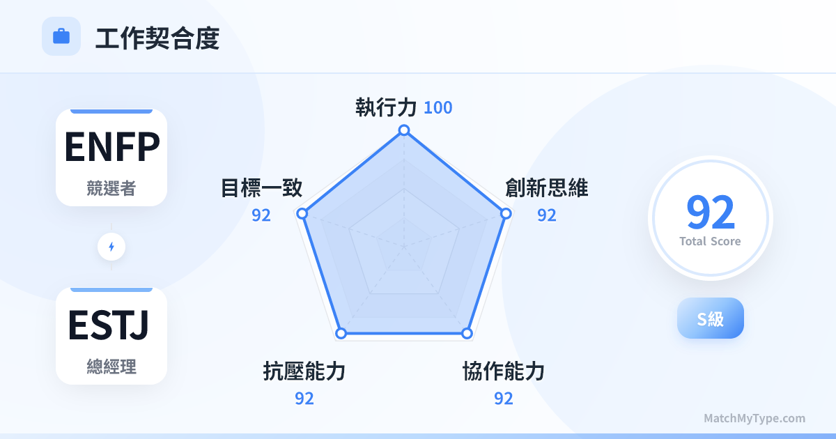 嚴師出高徒。ESTJ 老板對細節要求極高,會讓 ENFP 感到壓力山大。但如果 ENFP 能證明自己的創意能帶來真金白銀的業績,ESTJ 會給予極大的資源支持。建議 ENFP 少談情懷,多拿結果說話。