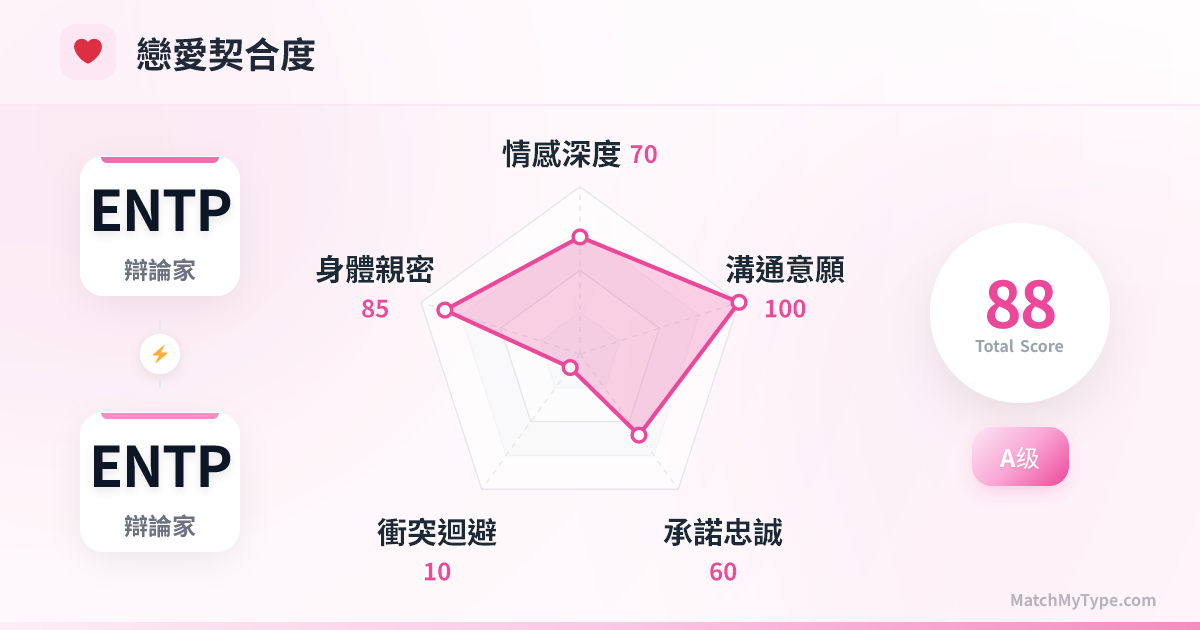 和另一個 ENTP 談戀愛,本質上是一種極度自戀的表現——因為你愛上的正是那個「聰明、幽默、有點壞壞的」自己。這段關係充滿了高強度的智力博弈和黑色幽默,你們既是戀人,又是共犯,還是彼此最嚴厲的辯論對手。