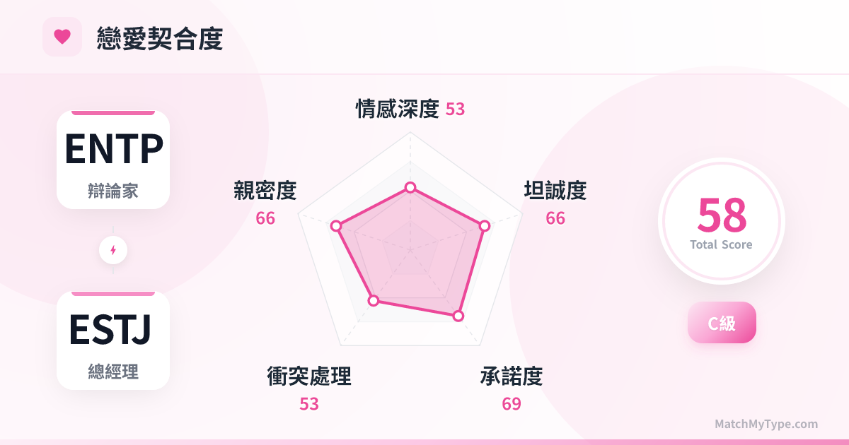 ESTJ 被 ENTP 的機智、跳躍性思維和打破常規的勇氣所吸引,這觸動了 ESTJ 隱藏的第三功能 Ne(外向直覺),讓他們看到了循規蹈矩之外的無限可能。而 ENTP 則會被 ESTJ 那種強大的氣場、果斷的決策力和驚人的辦事效率所折服,ENTP 混亂的生活急需 ESTJ 這種「定海神針」來穩住。這是一種「混亂渴望秩序,秩序羨慕自由」的原始張力。