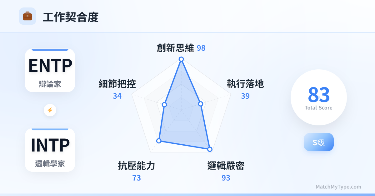 創新永動機。ENTP 擅長發散思維,尋找可能;INTP 擅長收斂思維,尋找漏洞。ENTP 提出「我們可以造一個飛向火星的電梯」,INTP 馬上計算「材料強度需要達到多少,目前的物理限制在哪裡」。這種 Ping-Pong 式的對話能以極快的速度迭代出高品質的方案。
