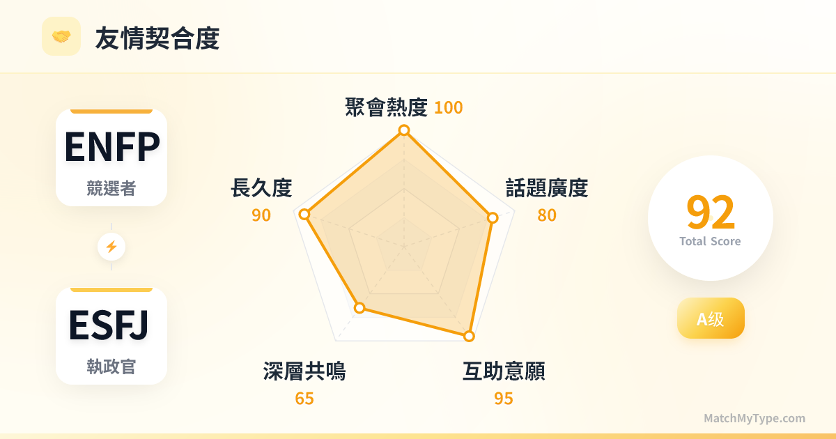 兩塊超強電池。ENFP 是那種「人來瘋」,在陌生人面前也能迅速自來熟;ESFJ 則是溫暖的東道主,確保每個人都有水喝。你們在一起可以連續社交三天三夜。不過,ENFP 偶爾會突然斷電(需要獨處充電),這時候 ESFJ 不要覺得被冷落,給他們一點空間就好。