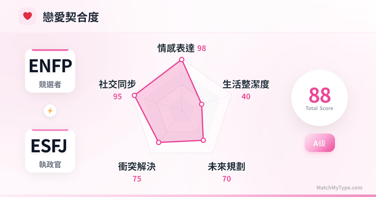 這是一對充滿歡聲笑語的「雙E」組合。ENFP 的天馬行空能點亮 ESFJ 略顯按部就班的生活,而 ESFJ 無微不至的照顧能讓 ENFP 在混亂中找到歸屬感。然而,當「追求新鮮感」遇上「渴望穩定性」,S 與 N 的底層衝突將是關係最大的考驗。