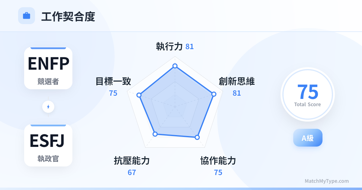 魅力型領袖。ENFP 老闆點子多、願景大,但經常變卦。ESFJ 下屬會是完美的執行者,幫老闆把抽象的想法落地,並安撫被老闆折騰的團隊成員。建議 ENFP 充分信任 ESFJ 的流程管理能力。