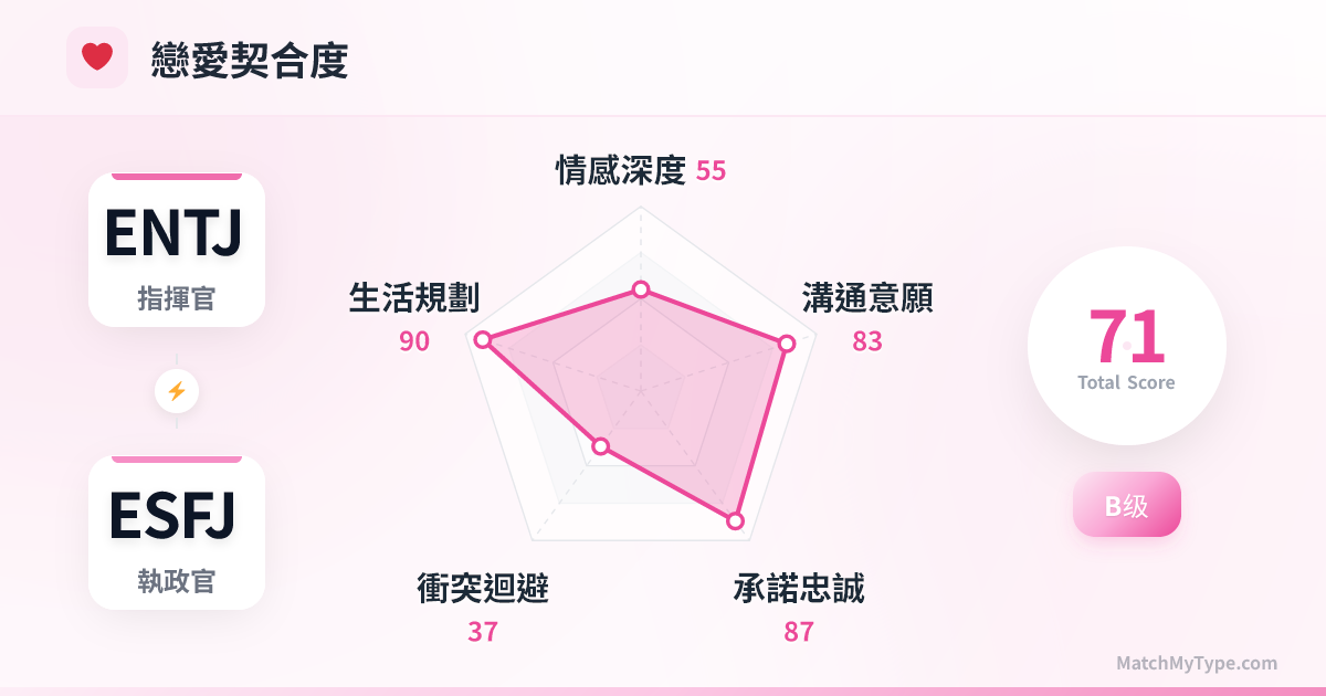 恭喜,這是職場上最恐怖(褒義)的組合之一。如果說 ENTJ 是設計藍圖的建築師,ESFJ 就是那個能把磚頭一塊塊砌好並管好施工隊的工頭。你們的結合意味著:既有宏大的戰略,又有完美的執行,還有極高的團隊凝聚力。