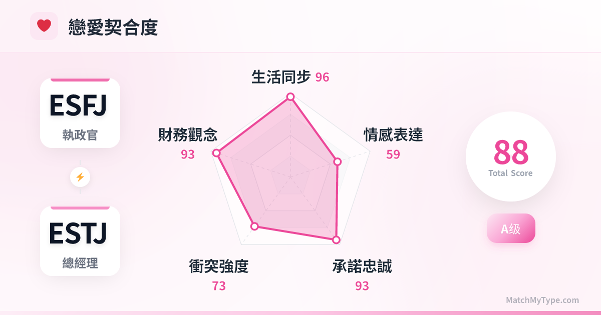 如果想要一段轟轟烈烈、充滿不確定性的浪漫劇,請出門左轉找 N 系人格。但如果想要一段穩定、體面、有著清晰規劃和共同奮鬥目標的婚姻,ESFJ 與 ESTJ 是當之無愧的冠軍組合。你們就像一家上市公司的 CEO 和 COO,分工明確地經營著生活。