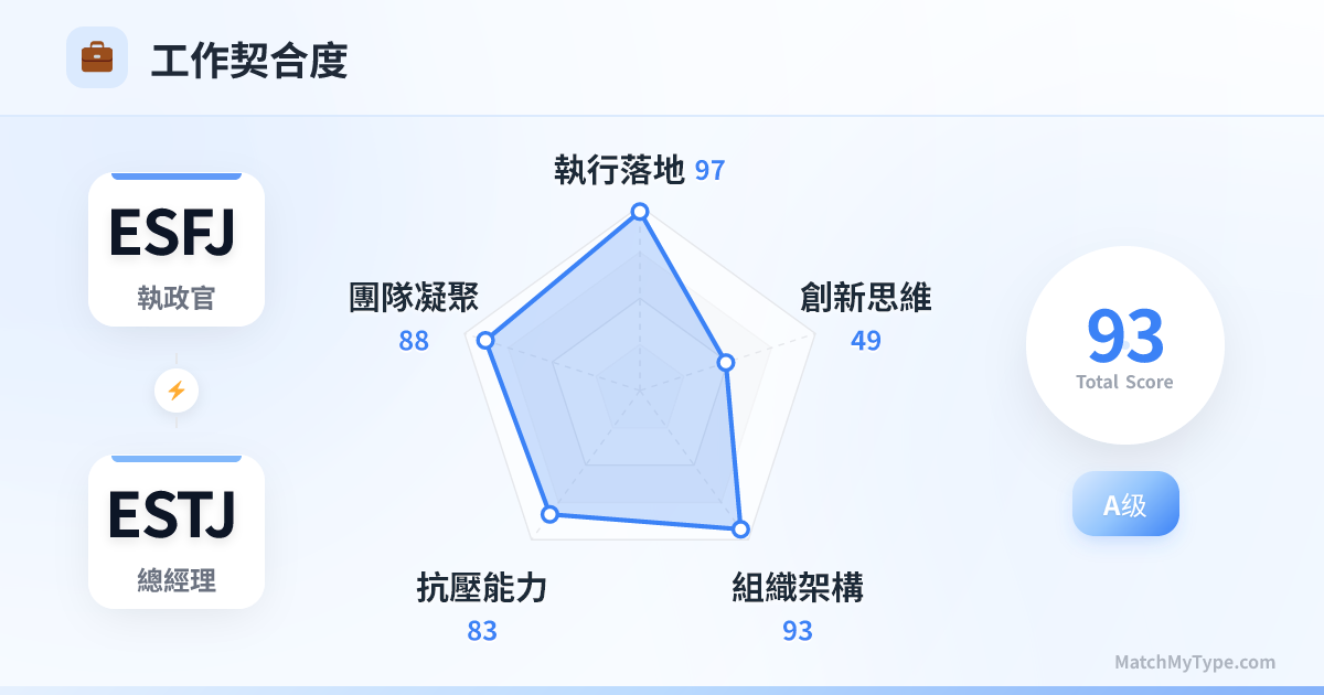 硬管理 + 軟實力的完美結合。ESTJ 擅長建立架構、設定 KPI、優化流程;ESFJ 擅長協調部門關係、安撫員工情緒、搞定難纏的客戶。ESTJ 搭建骨架,ESFJ 填充血肉。