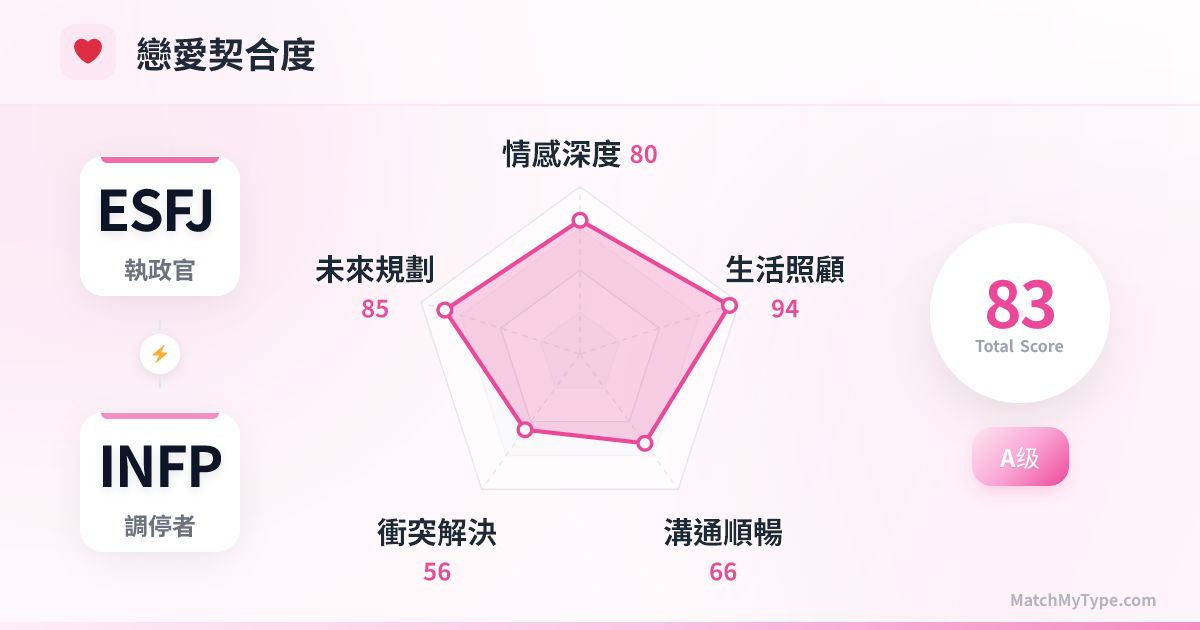 ESFJ 和 INFP 的組合就像是「熱牛奶加蜂蜜」,溫暖、甜美且治癒。ESFJ 渴望照顧他人,而 INFP 常常生活自理能力斷線且渴望被呵護,這種供需關係構成了兩人極強的初始吸引力。但隨著時間推移,現實主義與理想主義的摩擦在所難免。