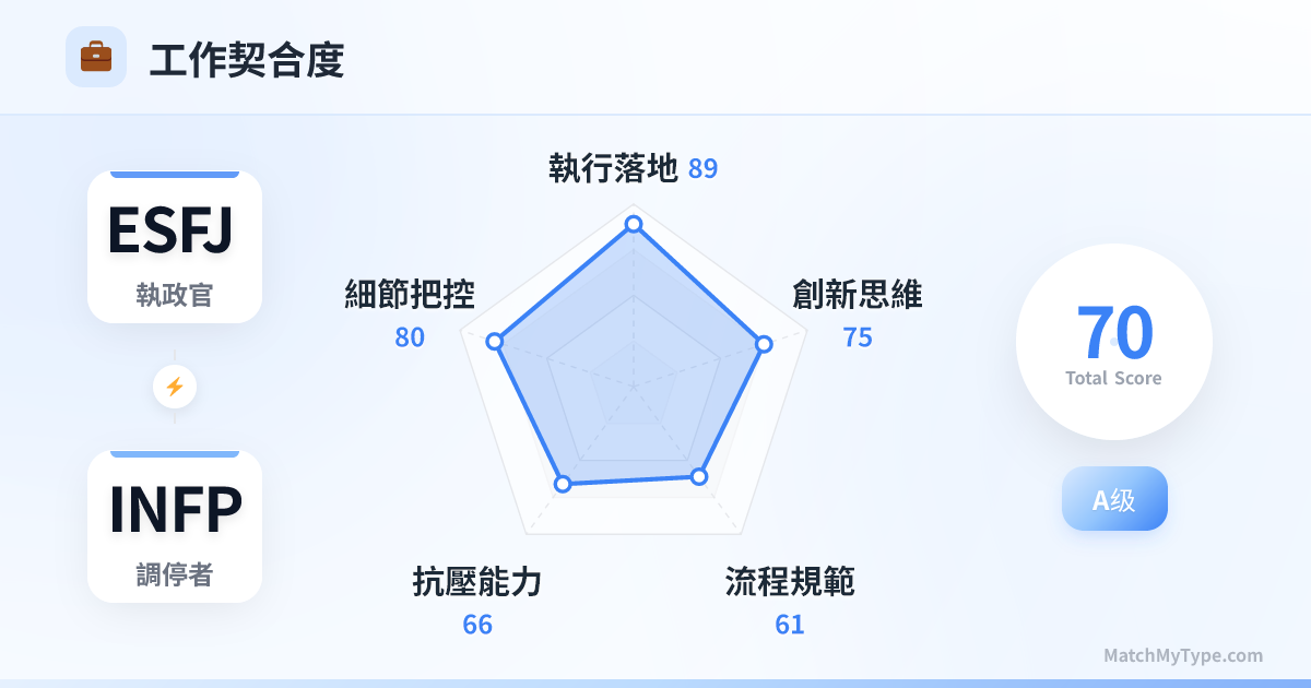 這是「大管家」與「設計師」的組合。ESFJ 擅長流程、行政、人事協調,INFP 擅長創意、文案、審美。只要分工明確,這就是一個能夠將創意完美落地的團隊。