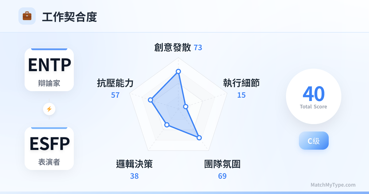 摸魚夥伴。如果坐在一起,你們可能會聊一整天八卦和新點子,效率為零。建議物理隔離:ENTP 負責後台策略,ESFP 負責前台接待或銷售。合作時,請務必拉上一個 ISTJ 或 INTJ 同事來負責記錄和執行。