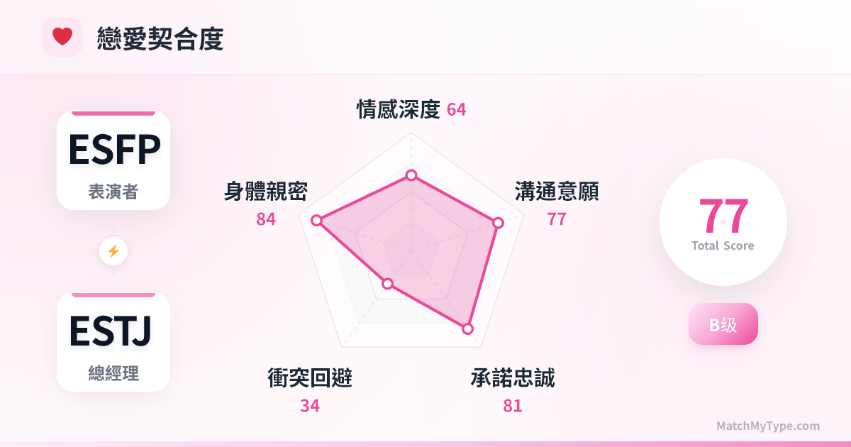 這是「經紀人」與「明星」的黃金組合。ESTJ 擅長幕後規劃、流程控制和資源整合,ESFP 擅長台前展示、客戶溝通和活躍氣氛。只要放對位置,你們就是印鈔機。