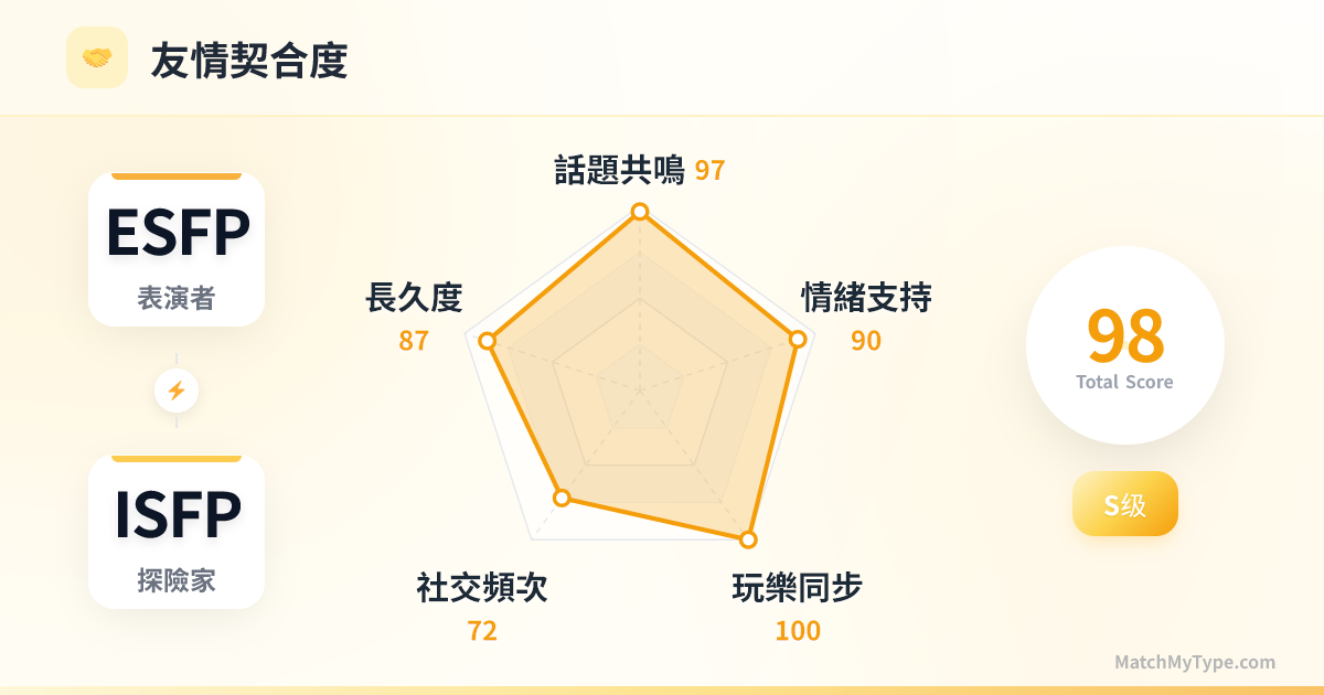 你們是朋友圈裡最讓人羨慕的「會玩組合」。只要有你們在,聚會就永遠不會冷場。ESFP 負責熱場,ISFP 負責格調,簡直是天作之合。