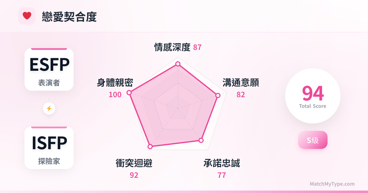 在身體層面,這對組合是 MBTI 中的頂級玩家。Se 功能讓兩人都極度重視觸覺、視覺和氛圍感。性生活對你們來說不僅僅是發洩,更像是一場互動的行為藝術。 ESFP 通常更加熱情、主動,喜歡嘗試新花樣和營造激情;ISFP 則更加細膩、感性,注重情感的流動和當下的感受。只要氛圍到位,兩人的契合度極高。唯一的障礙是,如果白天發生了情緒衝突(Fi),ISFP 可能會完全關閉身體接觸,而 ESFP 可能會試圖用性來解決矛盾,這會適得其反。