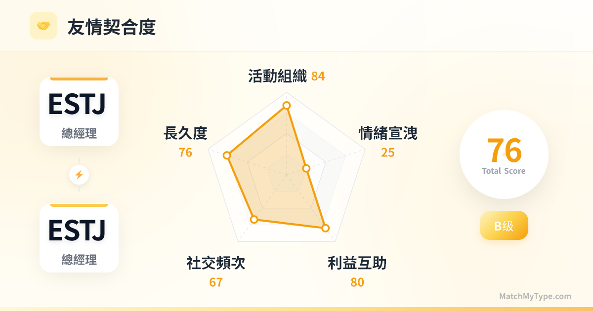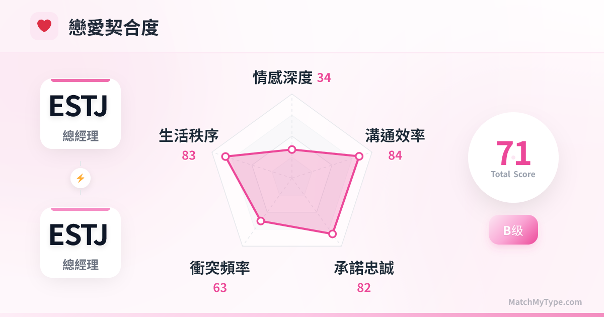 ESTJ 與 ESTJ 的結合,與其說是談戀愛,不如說是兩個優秀的企業家決定合併。你們不需要那些虛無縹緲的浪漫猜心遊戲,你們需要的是一個能跟得上自己節奏、價值觀一致、並且絕不掉鏈子的合夥人。這是一種基於高度理性和共同目標的「契約式」浪漫。