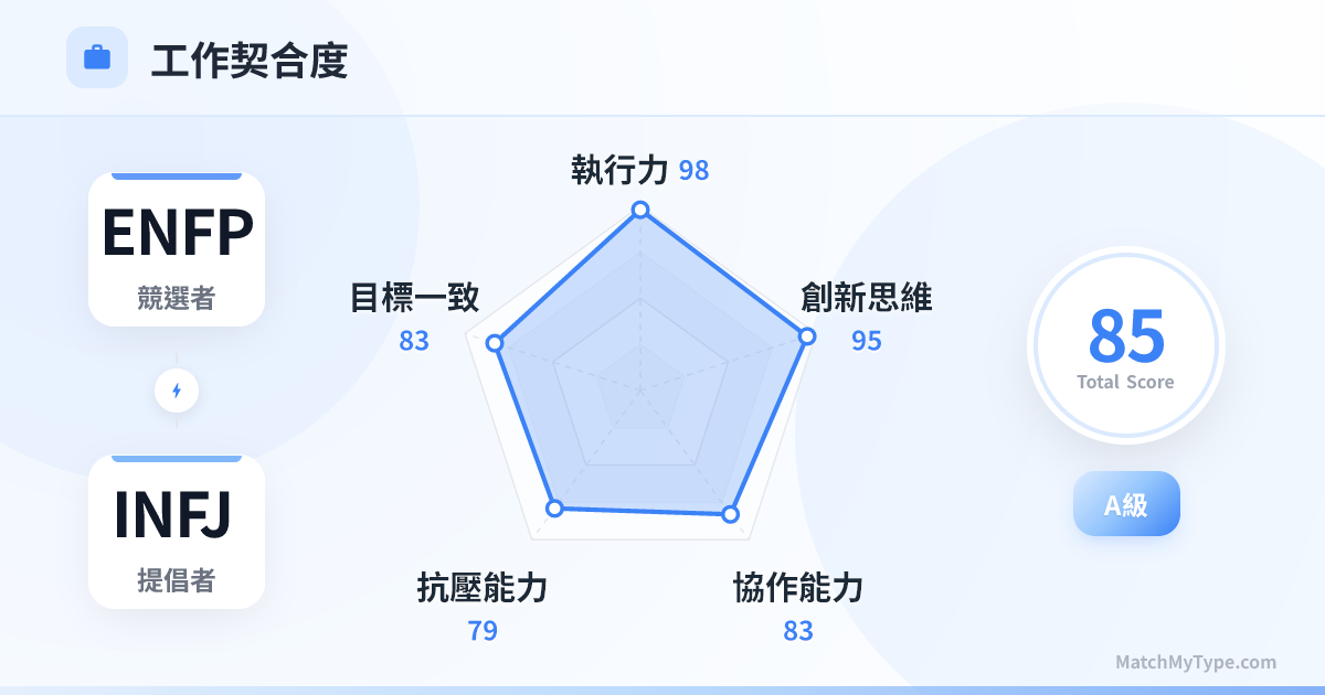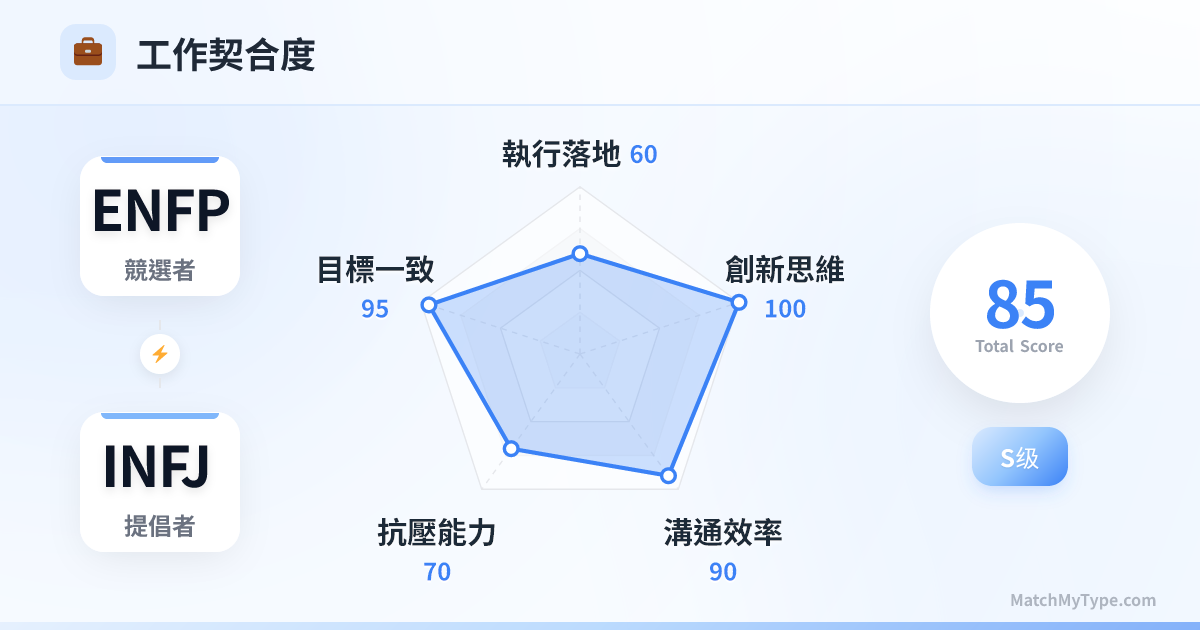 摸魚搭檔與靈感庫。如果坐在一起,可能會花一半上班時間聊八卦、聊人生。建議在創意階段緊密合作,但在執行階段分開:ENFP 去跑客戶、搞路演,INFJ 閉關寫方案、做規劃。