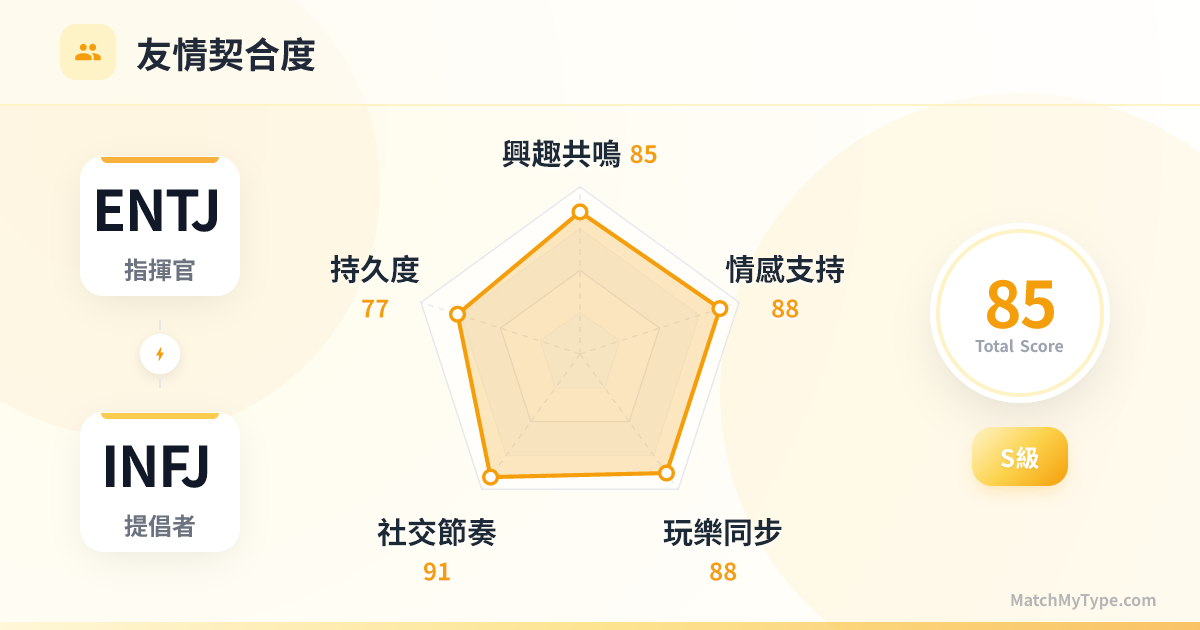 一旦度過磨合期,ENTJ 學會了先處理情緒再處理事情,INFJ 學會了直接表達需求而非讓人猜。兩人將形成極強的對外戰鬥力,成為彼此最堅實的後盾。