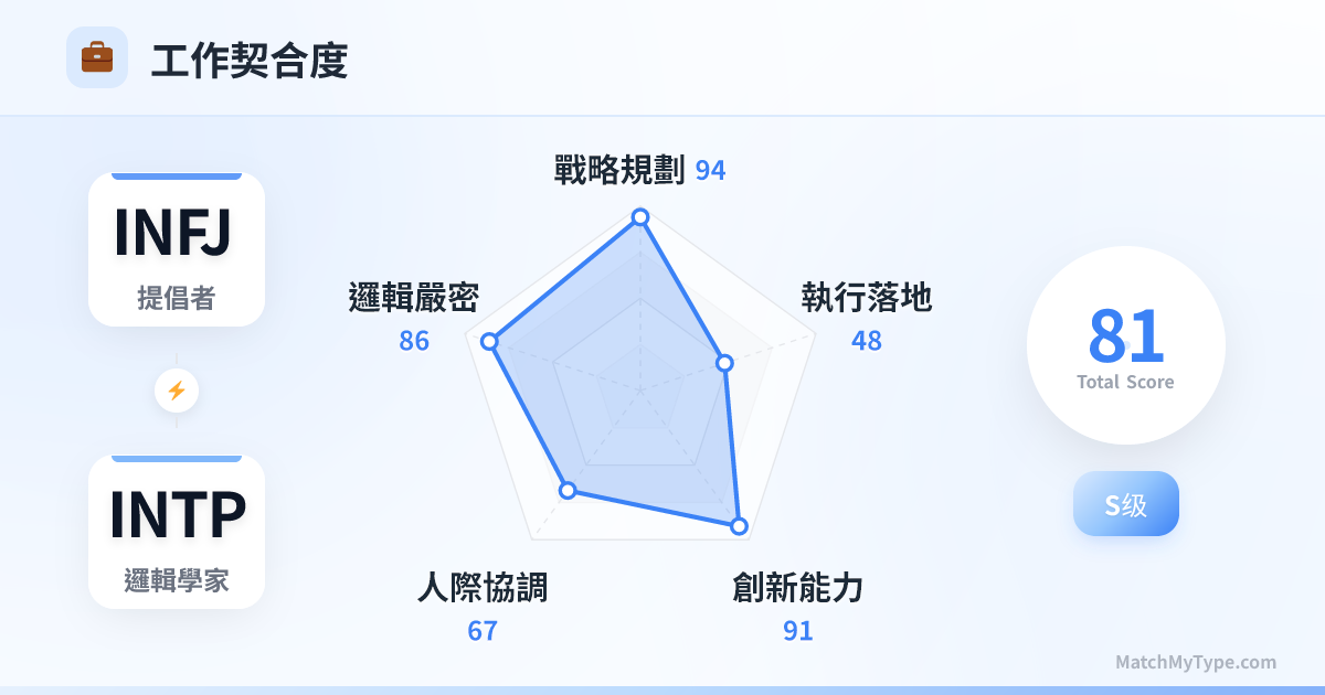 宏觀視角的完美統一。INFJ 擅長把握「人的因素」和「市場趨勢」(Ni+Fe),INTP 擅長解決複雜的技術難題和系統架構(Ti+Ne)。如果這是一家科技公司,INTP 是 CTO,INFJ 是 CPO(首席產品官)或 CHO(首席人力資源官),兩者配合能做出既有技術深度又有人文關懷的產品。
