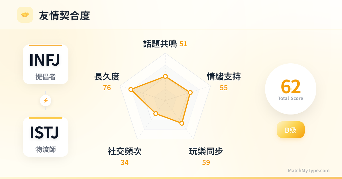 這是職場上的「夢之隊」。INFJ 指明方向,ISTJ 確保抵達。一個負責「做對的事」(戰略),一個負責「把事做對」(執行)。只要溝通順暢,沒有你們搞不定的項目。