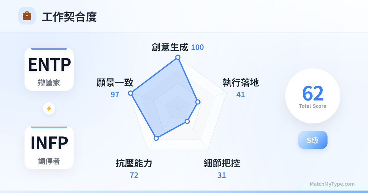 - 2**INFP 的被動攻擊**:當 INFP 生氣時,不要讓 ENTP 猜謎。ENTP 的讀心術僅限於邏輯推導,讀不懂你的情緒密碼。直接說出來比冷戰有效一萬倍。
