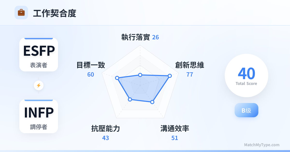 兩人都需要大量的正向回饋。ESFP 需要被誇「做得好」、「有魅力」;INFP 需要被誇「有想法」、「很獨特」。互誇是提升效率的燃料。