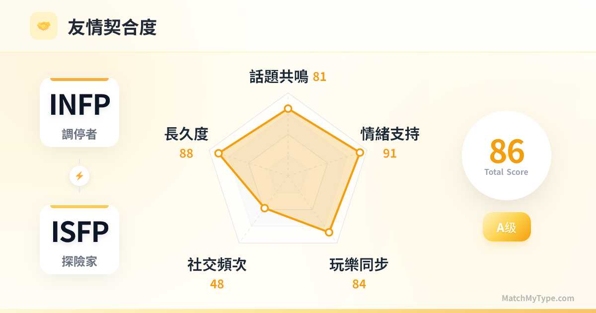 兩人都是內向者(I 人),社交電量都很低。這意味著你們非常理解對方突然的「失蹤」和「不想回訊息」。你們的聚會通常是低能耗的,不需要刻意找話題,也不需要偽裝熱情。這種「低壓社交」是這段友情能長久維持的核心。