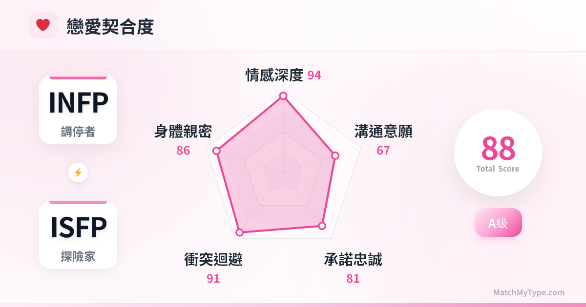 這是一種「照鏡子但又不一樣」的奇妙吸引。兩人都由內向情感 (Fi) 主導,這意味著你們都擁有極高的同理心、獨特的審美和對「真實自我」的執著追求。INFP 會被 ISFP 身上那種隨性、鬆弛以及獨特的時尚品味所吸引,覺得他們是活在當下的精靈;ISFP 則會被 INFP 深邃的思想、天馬行空的腦洞和溫柔的包容力所打動。你們在一起,終於不用向對方解釋「我為什麼突然難過了」,因為對方懂。