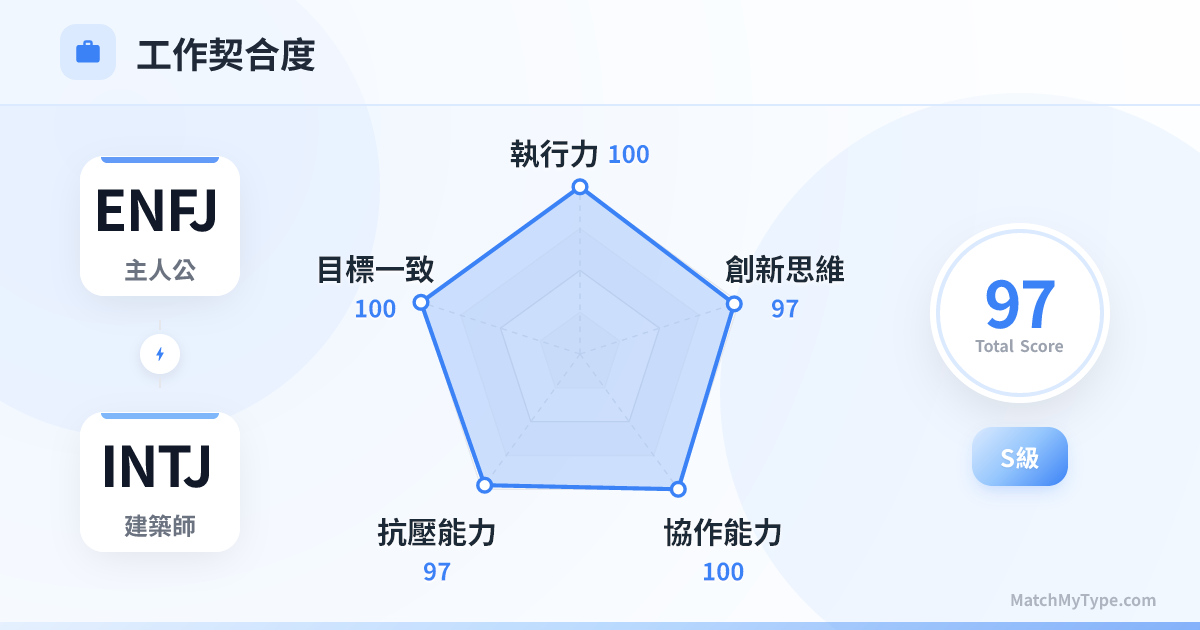 黃金搭檔。一個負責台前(路演、談判),一個負責幕後(策劃、數據)。只要分工明確,互不干涉專業領域,效率極高。切記:ENFJ 不要試圖教 INTJ 怎麼做人,INTJ 不要當眾質疑 ENFJ 的演講邏輯。