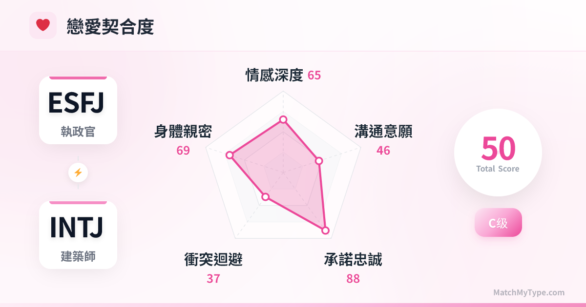- 2**INTJ 的「冷暴力」**:當發生衝突時,INTJ 傾向於關門獨處分析問題,而 ESFJ 需要立刻的情緒回饋。INTJ 的沉默對 ESFJ 來說是精神凌遲。