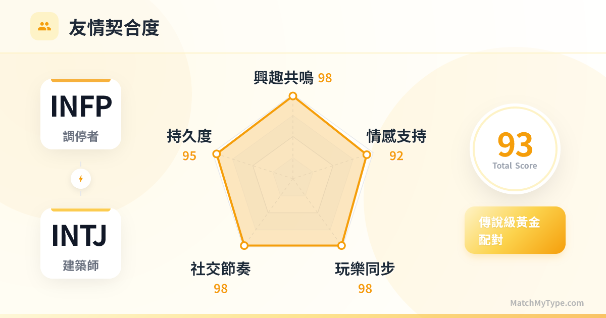兩個內向者(I人)的狂歡。你們是彼此的「社交擋箭牌」。在大型聚會上,你們會默契地躲在角落裡吐槽其他人,或者一起先行溜走。INTJ 欣賞 INFP 的安靜,INFP 感激 INTJ 不強迫自己說話。你們的能量槽恢復方式高度一致:回家,關門,獨處。