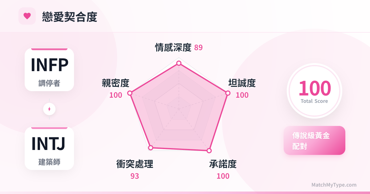 恰恰相反。INTJ 的冷漠是對外的,他們把所有的溫柔和耐心都留給了唯一的伴侶(Fi Child)。INFP 擁有極強的洞察力,能透過 INTJ 面癱的表情看到他們笨拙但真誠的愛意。INTJ 的愛不是甜言蜜語,而是「幫你解決麻煩」、「為你規劃未來」以及「無條件的忠誠」。對於追求真摯情感的 INFP 來說,這種愛比表面功夫更珍貴。