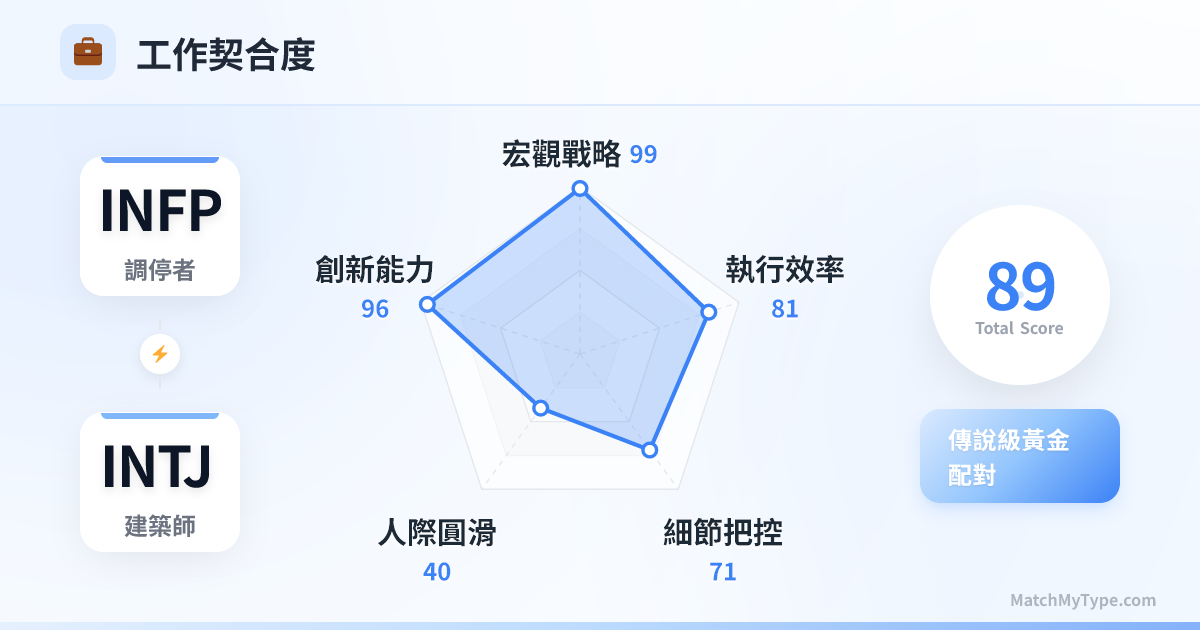 宏大敘事與落地執行的完美閉環。INFP 擅長發掘用戶深層的情感需求(Why),INTJ 擅長設計達成目標的路徑(How)。在創意產業、產品設計、諮詢領域,這種組合無堅不摧。