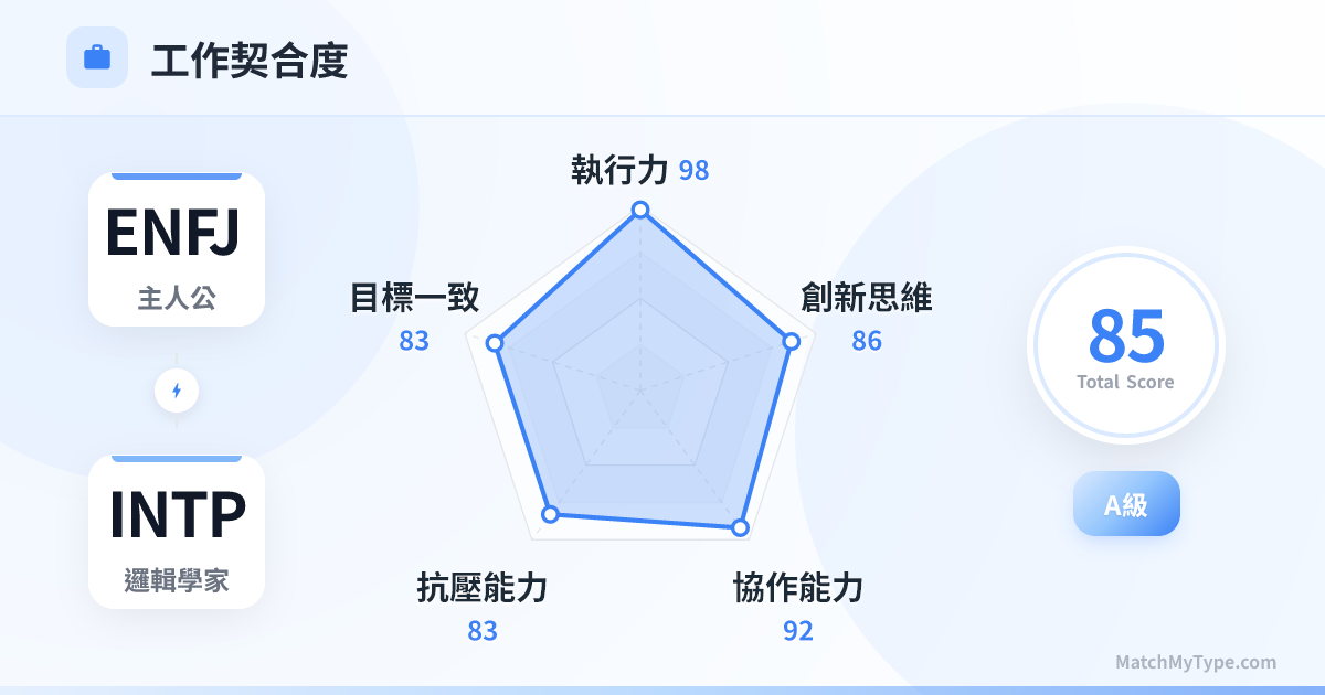 互補戰友。ENFJ 負責對外(客戶、跨部門),INTP 負責對內(技術、內容)。開會時,INTP 負責提供乾貨,ENFJ 負責控制節奏和活躍氣氛,避免冷場。