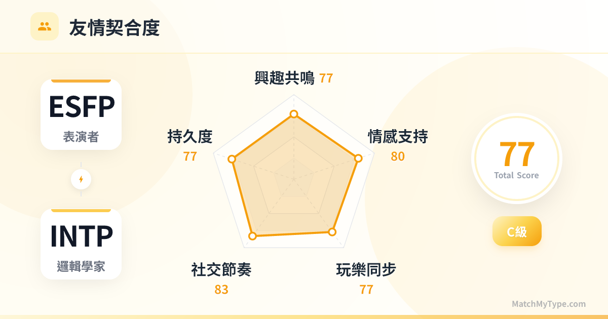 完全不對等。ESFP 是核電站,INTP 是蓄電池。ESFP 需要通過社交充電,INTP 社交一小時需要充電一天。作為朋友,ESFP 必須理解 INTP 的「突然消失」不是絕交,只是沒電了。最佳模式是:ESFP 組局,INTP 參加前半場,吃好喝好後允許 INTP 提前離場,不要強留。