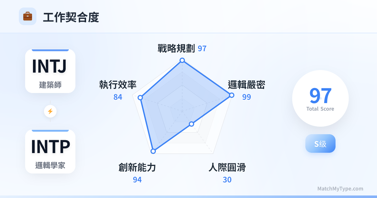 這是科技界、學術界和諮詢界的夢幻團隊。INTJ 負責定戰略、控進度,INTP 負責搞技術、補漏洞。只要不讓他們去搞公關或客服,他們能構建出最完美的系統。