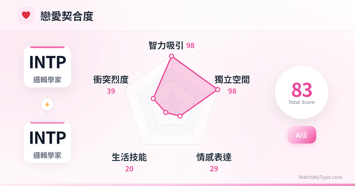 這是一種「照鏡子」般的驚喜。INTP 習慣了被周圍人視為「怪胎」、「槓精」或「冷漠的人」,但遇到另一個 INTP 時,那種孤獨感瞬間消散。你們能聽懂彼此最冷門的笑話,能跟上對方跳躍性極強的邏輯閉環。這種智力上的勢均力敵(Sapiosexuality)是極其性感的,你們會被對方大腦的性感程度深深迷住,彷彿找到了世界上唯一能解開自己代碼的駭客。