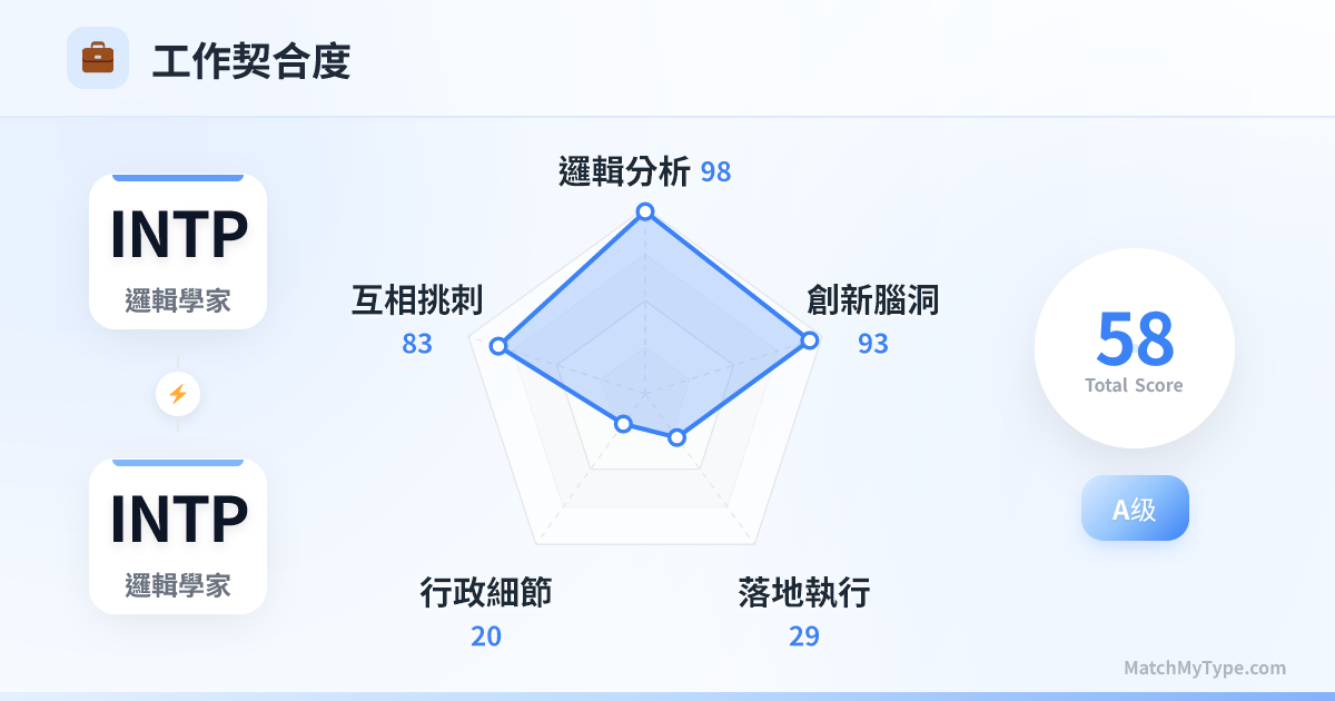 極致的糾錯能力與創新思維。一個 INTP 提出方案,另一個能瞬間透過 Ti 掃描出邏輯漏洞並提出修正,透過 Ne 擴展出更優解。這種迭代速度極快,且雙方都不會因為被反駁而感到受傷(只要你說得有道理)。