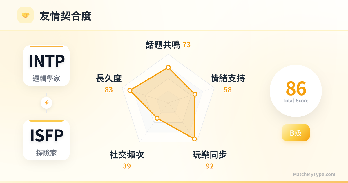 完美匹配。兩人都是低電量生物,都喜歡宅。你們可以待在同一個房間裡,INTP 玩電腦,ISFP 滑手機,三個小時不說一句話,但完全不覺得尷尬。這種「平行遊戲」 (Parallel Play) 的模式是你們友誼的基石。