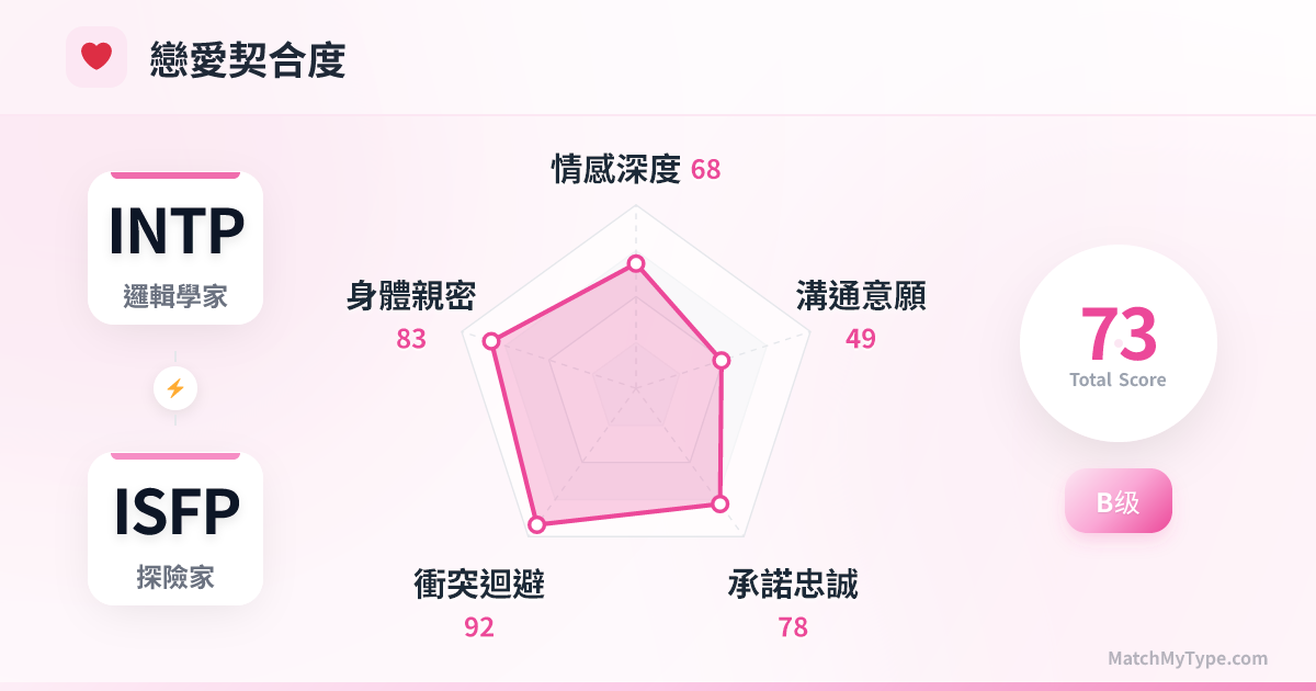 INTP 和 ISFP 的組合就像是「程式碼」遇到了「油畫」。兩人都是內向的探索者(IxxP),都極度珍視個人空間和自由。這種關係通常開始於彼此的神秘感,維持於互不打擾的舒適,但往往受困於「雞同鴨講」的深層溝通障礙。