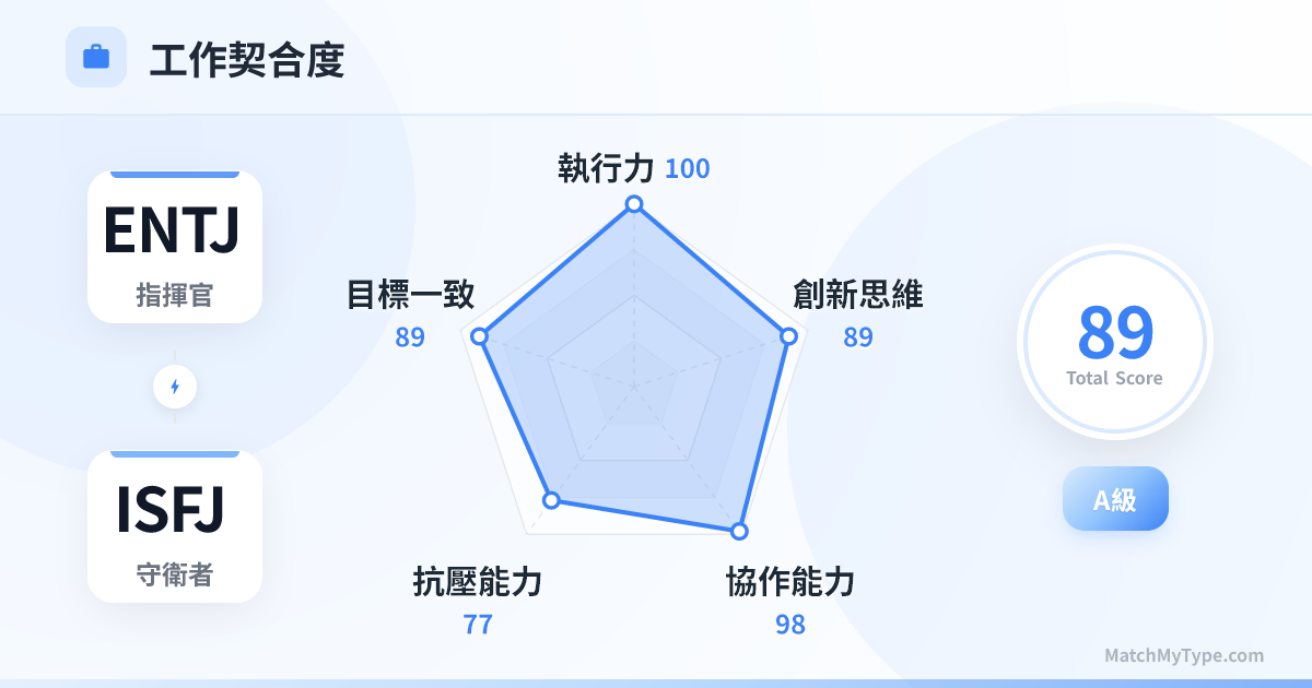 天作之合。ENTJ 只要給出明確的目標和截止日期,ISFJ 就能完美交付。ENTJ 需要注意的是:不要吝嗇你的讚美。ISFJ 是需要正向回饋驅動的,偶爾一句「做得好,沒你不行」能讓 ISFJ 肝腦塗地。
